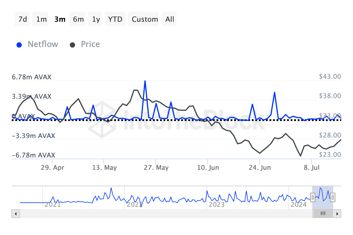 Obwohl der Wert von AVAX in der letzten Woche um fast zehn Prozent gestiegen ist, ist der Nettofluss der großen Inhaber stark gefallen. Laut Daten von IntoTheBlock sank er in diesem Zeitraum um 1,43 Prozent. In den letzten 30 Tagen fiel er um über 40 Prozent.