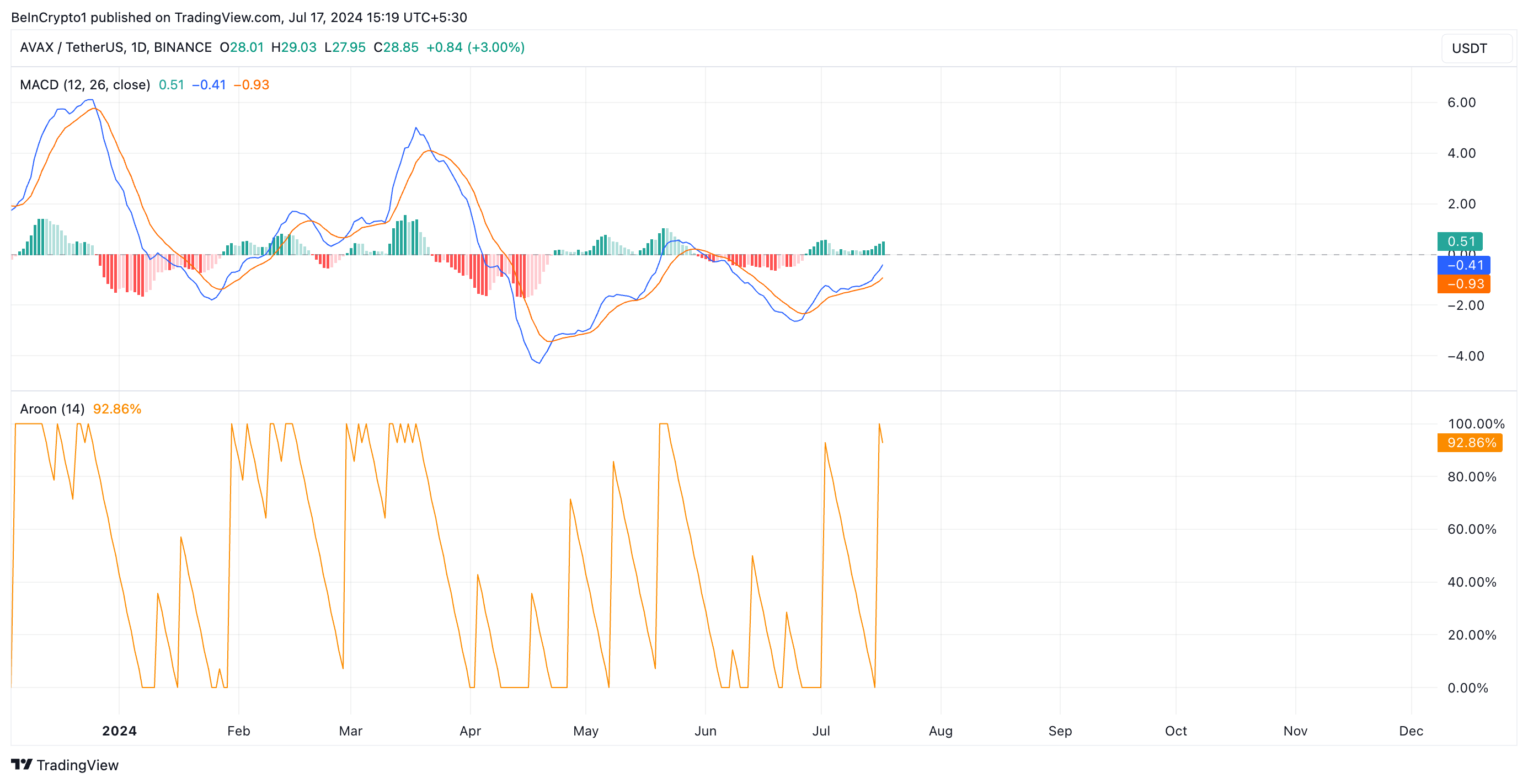 Zum Beispiel bestätigt sein Aroon-Indikator, dass der aktuelle Aufwärtstrend stark ist. Die Aroon-Up-Linie des Tokens liegt bei 92,86 Prozent. Dieser Indikator ermittelt die Stärke eines Trends und potenzielle Punkte für eine Kursumkehr. Wenn die Aroon-Up-Linie nahe 100 liegt, zeigt dies an, dass der Aufwärtstrend stark ist und das jüngste Hoch relativ kürzlich erreicht wurde.