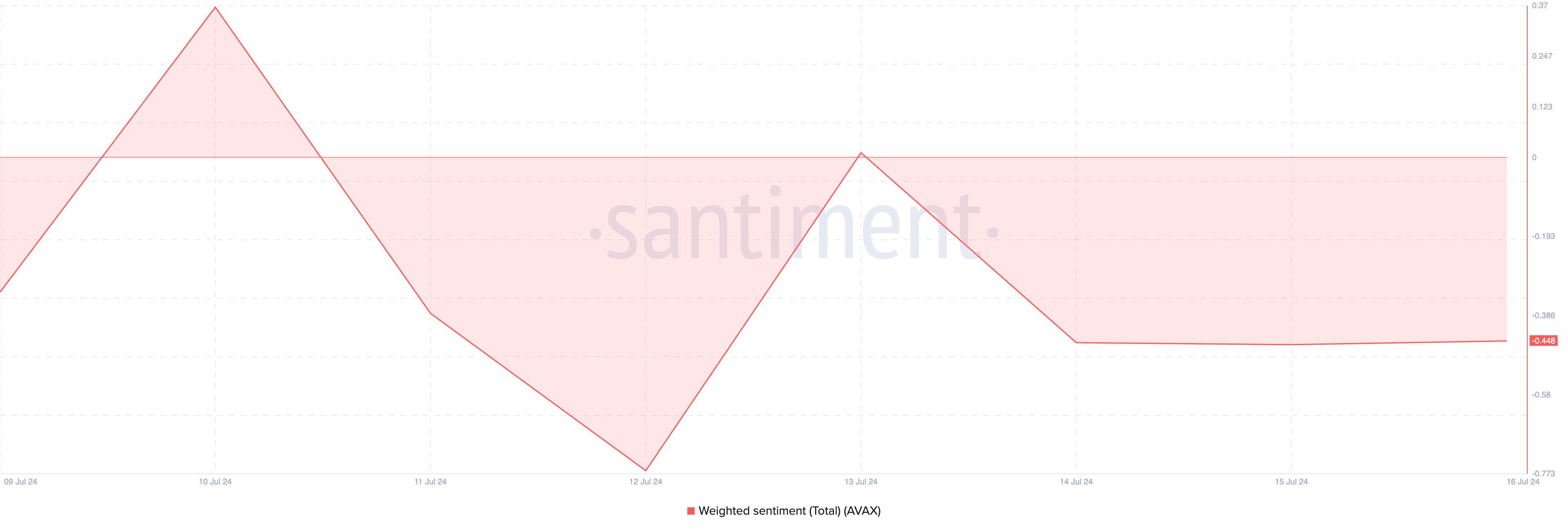 Sponsored SponsoredDer Verkauf durch die Wale könnte auf die bärischen Stimmungen zurückzuführen sein, die AVAX trotz des Aufschwungs der letzten Woche heimsuchen. Daten von Santiment zeigen, dass sein gewichtetes Sentiment in den letzten sieben Tagen negativ geblieben ist. Zum Zeitpunkt dieses Schreibens beträgt es -0,48 Prozent.