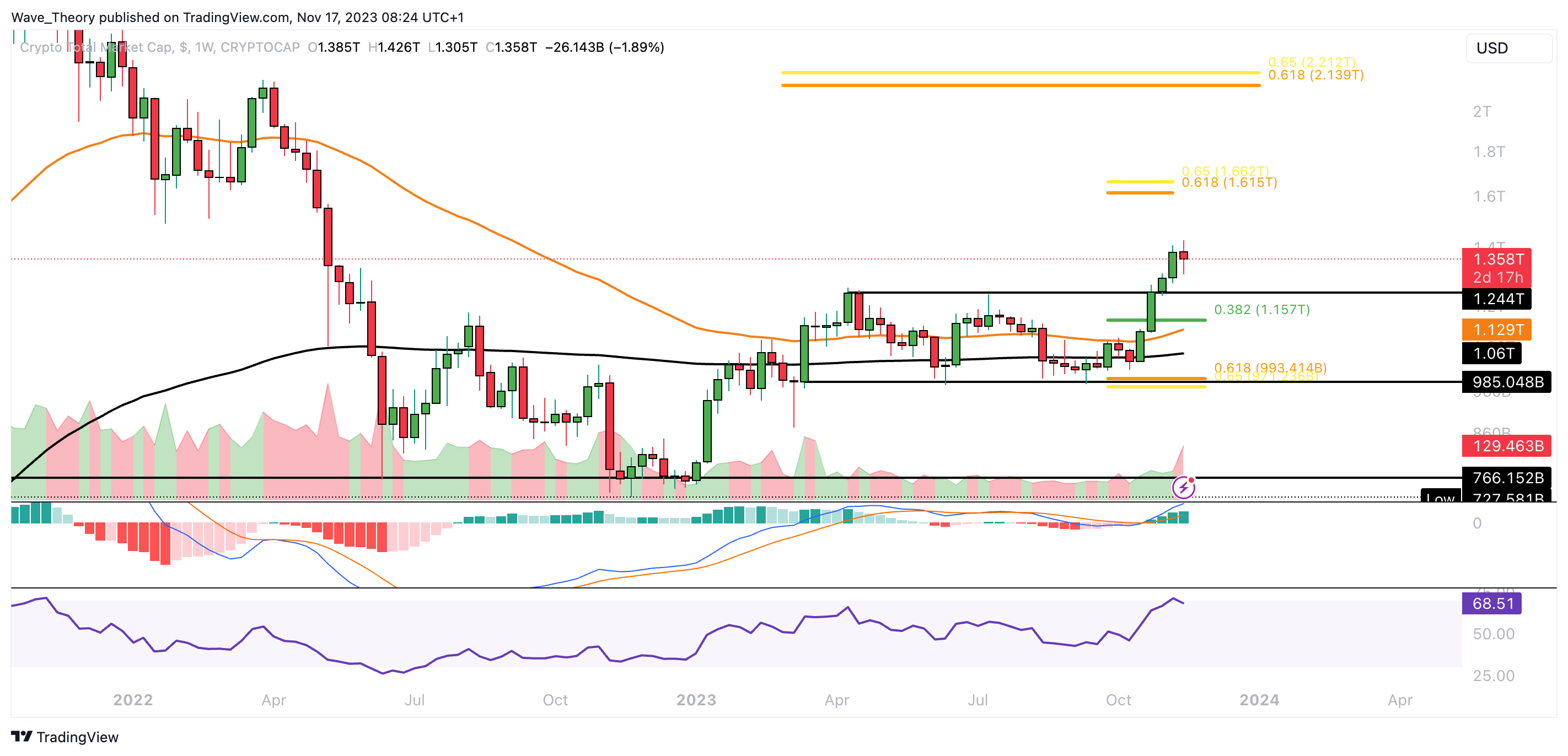 Damit könnte der Krypto-Markt mittelfristig auf eine Marktkapitalisierung von rund 1,615 Billionen USD steigen. Denn dort liegt der nächste signifikante Fibonacci Widerstand.