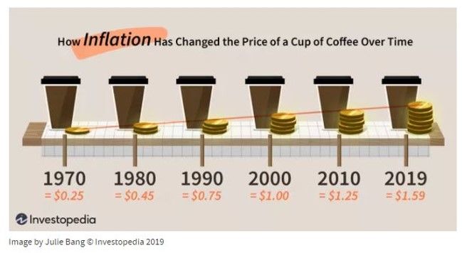 Was dies bedeutet? Güter und Dienstleistungen werden von Monat zu Monat teurer. Ein Überschuss an Geld gegenüber Dienstleistungen. Am einfachsten lässt sich dies am Beispiel eines Bechers Kaffee zeigen: