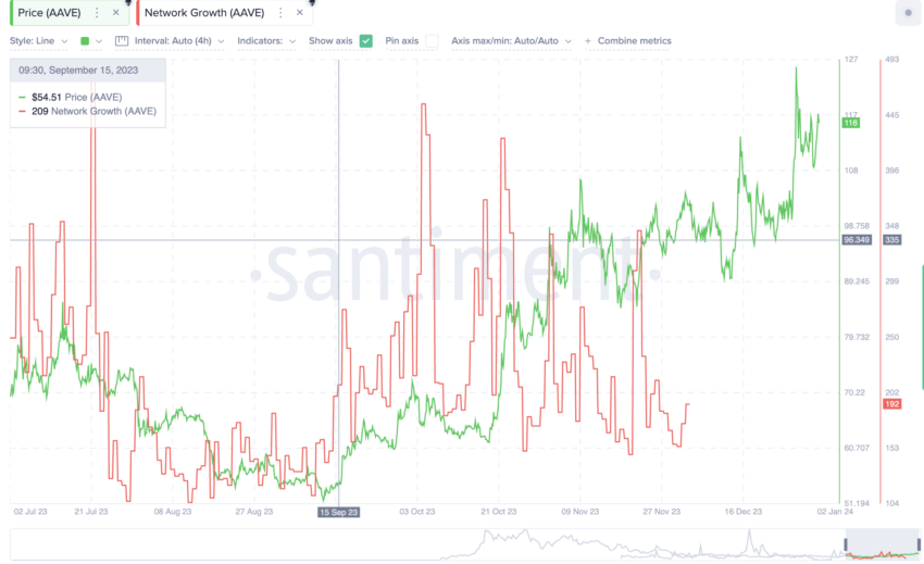 Eine weitere interessante On-Chain-Kennzahl ist das tägliche Netzwerkwachstum. Nach dem Zusammenbruch von FTX stieg die Netzwerkaktivität in Bezug auf Aave stetig an, wobei sich um den 21. Juli 2023 ein Höhepunkt bildete. Seitdem ist das Netzwerkwachstum stetig, was zum Preisanstieg von AAVE beigetragen hat.