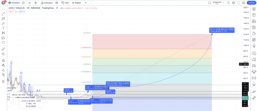 Wir haben jetzt ein Hoch im Jahr 2026 und ein Preistief für 2025 prognostiziert. Wir können diese Punkte mit Hilfe des Fibonacci-Indikators verbinden, was uns helfen wird, den Weg des AAVE bis 2030 zu verfolgen.