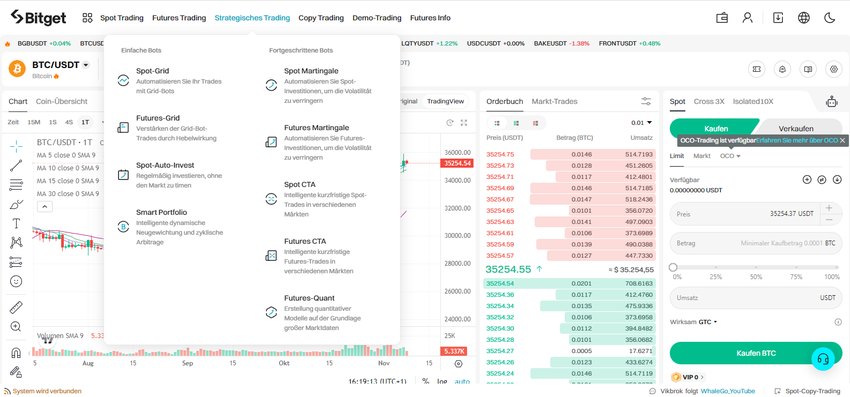 Die Börse bietet verschiedene Handelsbots an, die sowohl für Einsteiger als auch für erfahrene Trader geeignet sind – darunter etwa der Spot Grid Bot und der Spot Dollar-Cost-Averaging Bot.