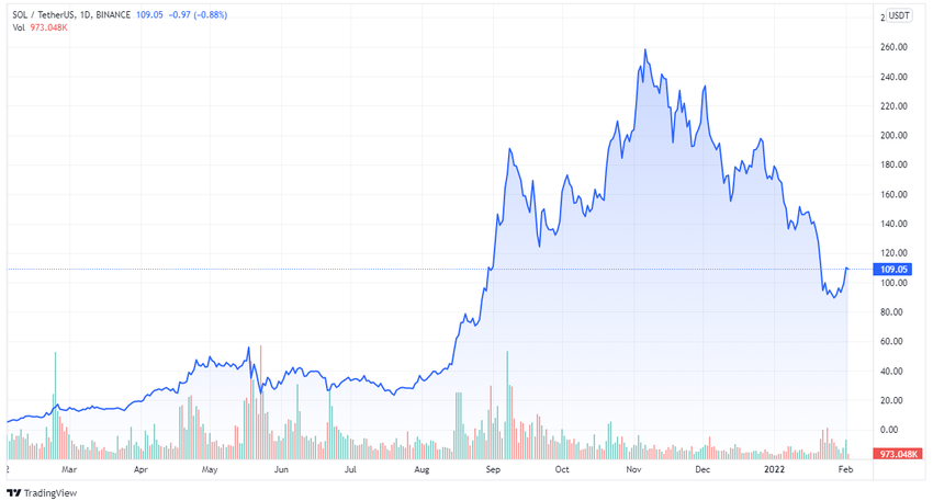 Der Solana Kurs verzeichnete im Jahr 2021 ein herausragendes Wachstum. Zum Anfang des Jahres 2021 lag der Kurs bei 1,84 US-Dollar und erreichte im November ein Allzeithoch von 260 US-Dollar, was einem Preisanstieg von 14.000 % entspricht. Die vielen Partnerschaften und Netzwerkeinführungen des Projekts trugen ebenfalls zu dem Preisanstieg bei.