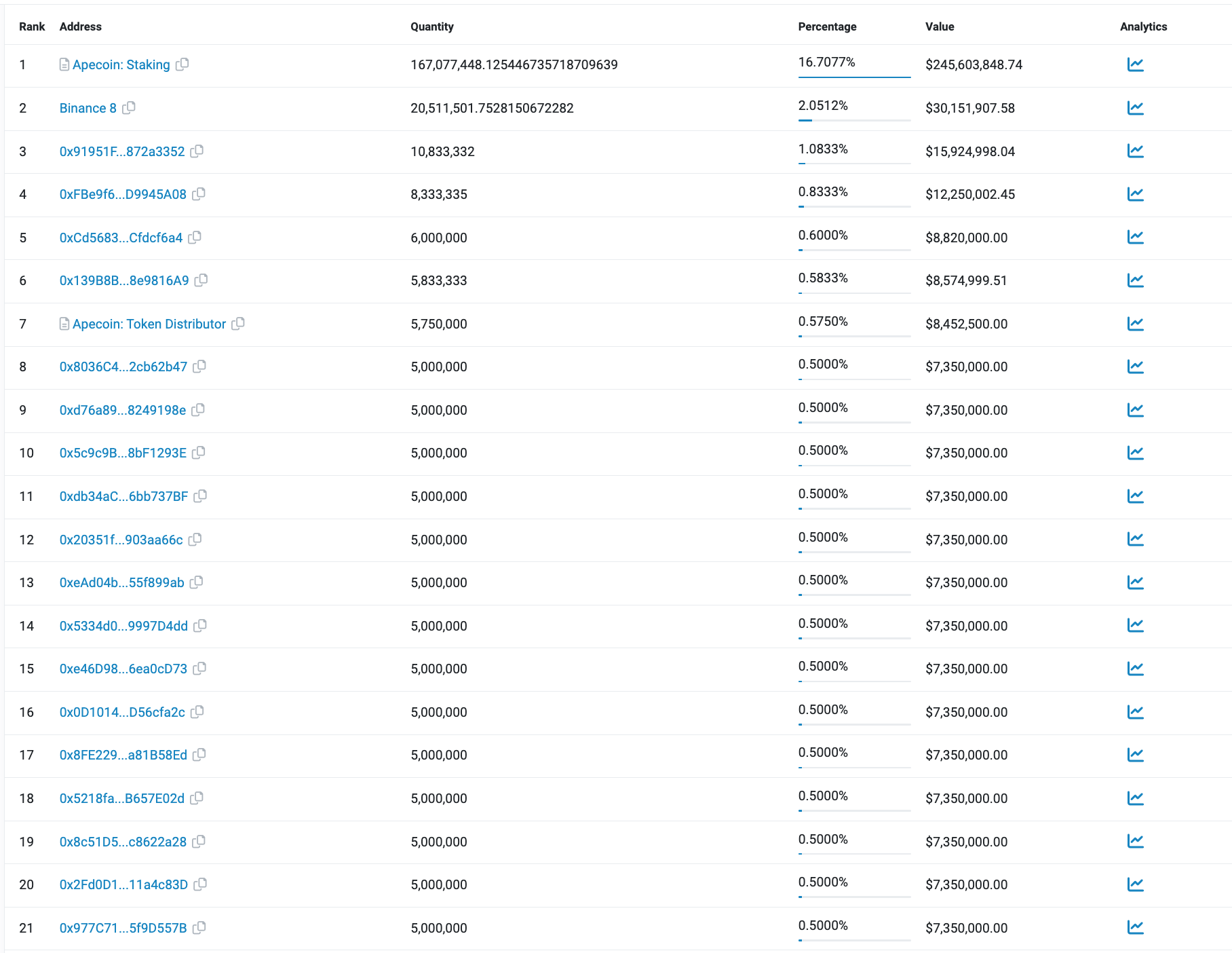 Unter größeren Anleger:innen ist es durchaus verbreitet, die eigenen Bestände auf mehrere Wallets zu verteilen, weshalb solche Statistiken mit Vorsicht zu genießen sind. Im Falle von Apecoin gehören die meisten Wallets mit identischen Beständen allerdings zum Projekt, wie hier zu sehen ist.