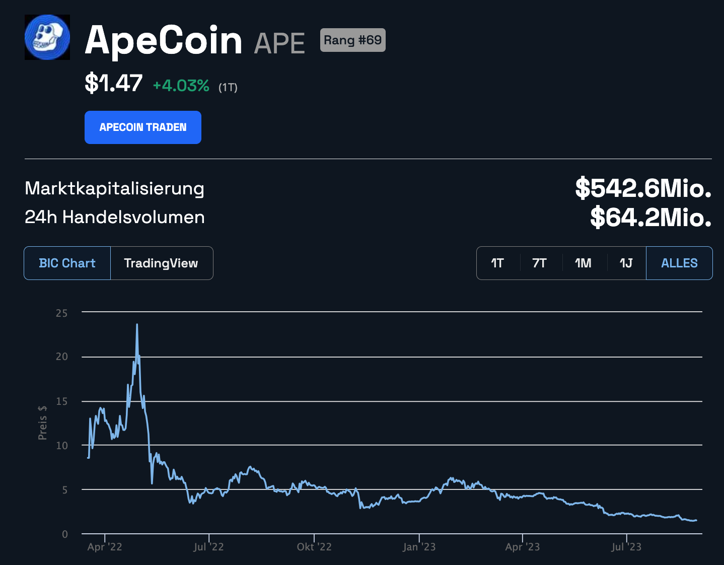 Mit etwa 1,28 USD befindet sich der APE Kurs aktuell erschreckende 95,07 % vom ATH bei 28 USD im März 2022 entfernt.