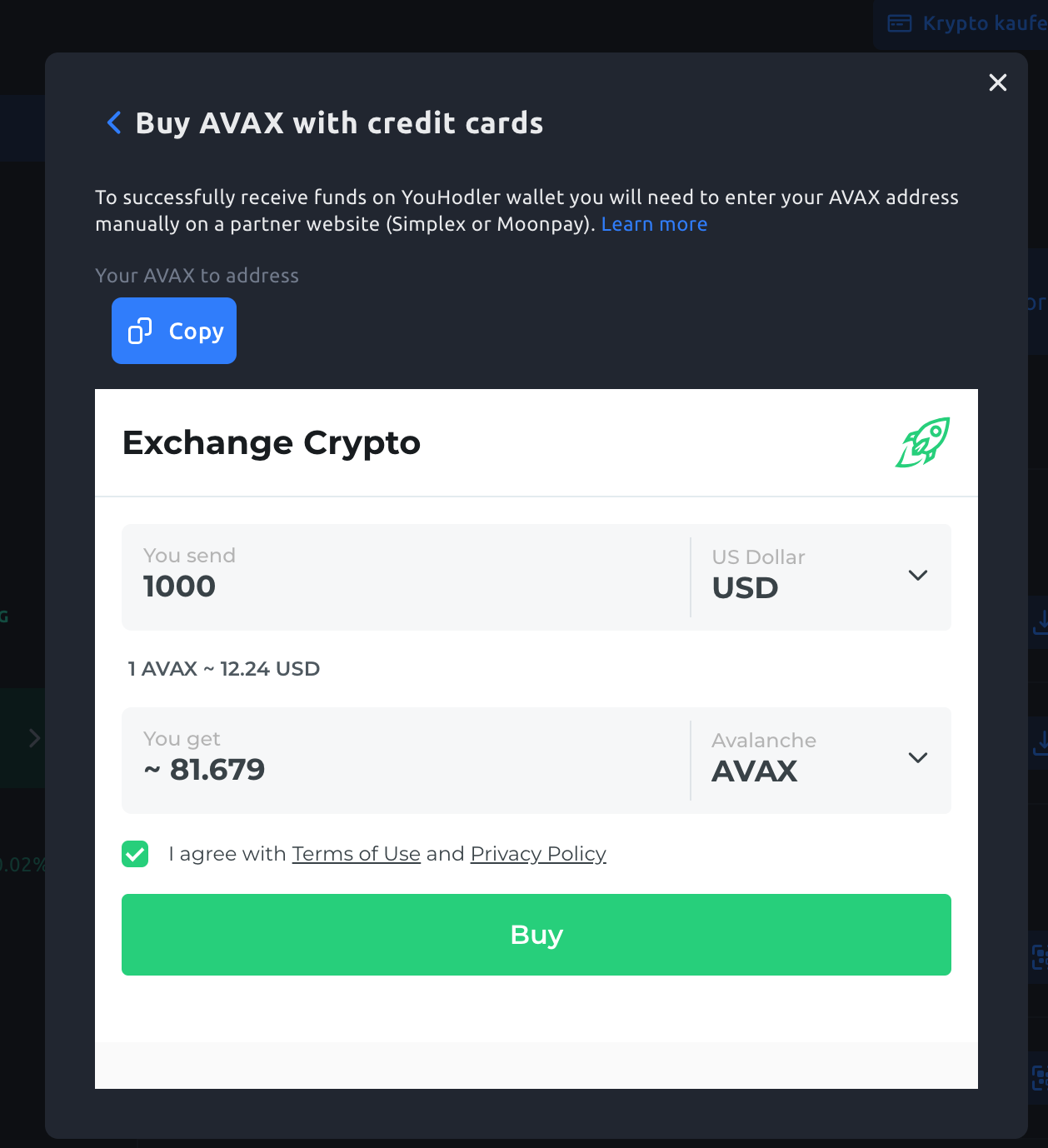 Schritt 3: Gib die gewünschte Summe ein, lies die Nutzungsbedingungen sowie Datenschutzrichtlinien und setze den Haken falls du einverstanden bist (Voraussetzung für den erfolgreichen Kauf). Das war’s, so einfach kannst du Avalanche kaufen!