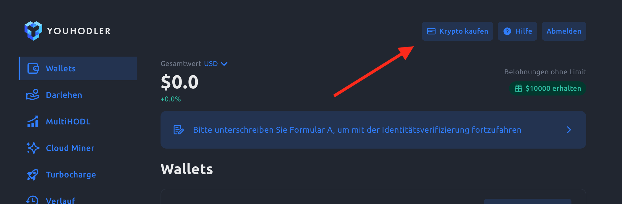 Schritt 1 Klicke oben rechts in der Ecke auf “Krypto kaufen”