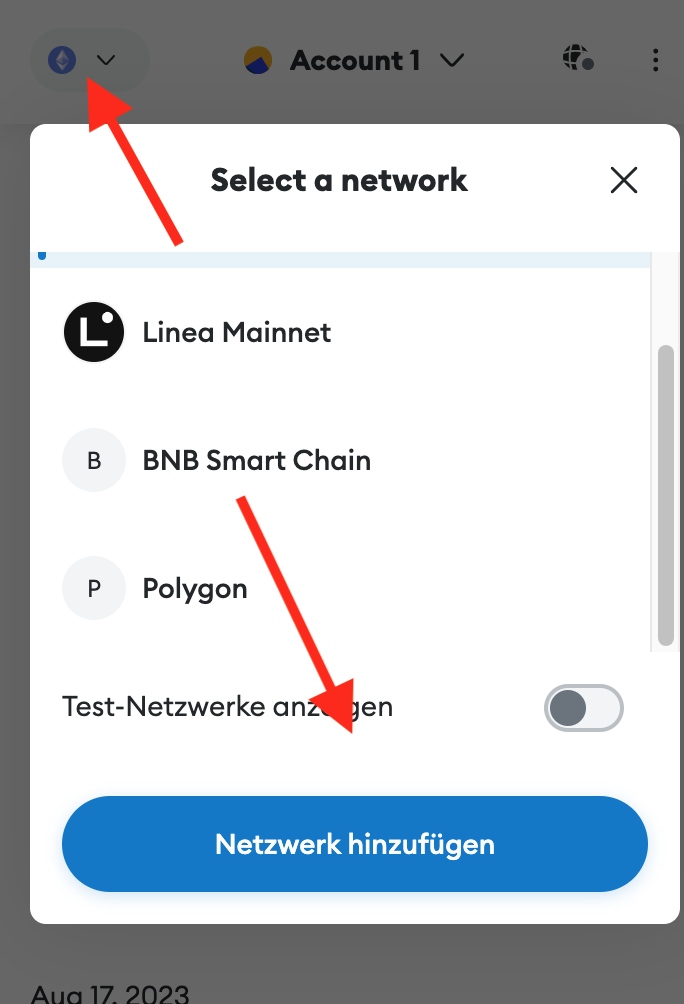 Schritt 1: Klicke auf das Dropdown-Menü in deiner Wallet und wähle “Netzwerk hinzufügen”.