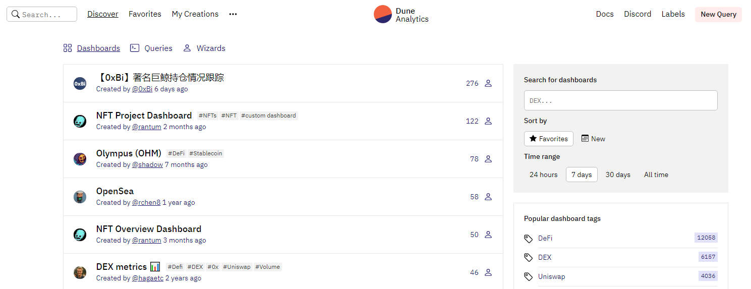 Dune Analytics wird für die Blockchain-Forschung verwendet. Es ist eines der beliebtesten DeFi-Analysetools. Benutzer können leicht benutzerdefinierte Abfragen erstellen, um Daten aus einer Blockchain zu visualisieren.