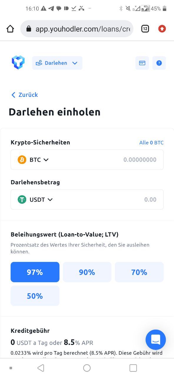 Anschließend verwende den Krypto-Darlehensrechner auf der Website, um zu entscheiden, wie viel du leihen möchtest. Wähle dann die Loan to Value Ratio aus .Dein Darlehen wird sofort genehmigt – es ist nicht notwendig, wie auf anderen Plattformen einen Kreditgeber zu finden.