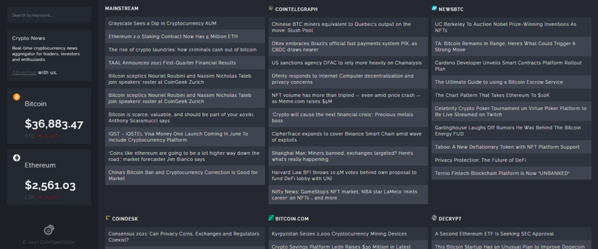 Es gibt eine Mainstream-Nachrichtenkategorie, wenn du auch wissen möchtest, was außerhalb von Krypto passiert. Ferner bietet die Plattform einen Bitcoin- und Ethereum-Preisticker. CoinSpectator bietet auch eine praktische Suchleiste, um schlüsselwortbezogene Nachrichten zu finden.