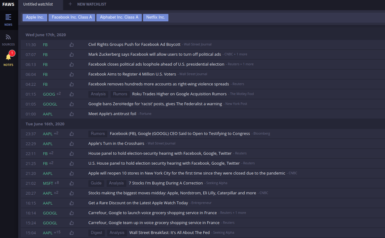 FAWS (Financial Aggregator Web Service) ist CryptoPanic sehr ähnlich in der minimalistischen Ästhetik. Außerdem kategorisiert es Neuigkeiten auch nach Tags, wie Defi oder Bitcoin.