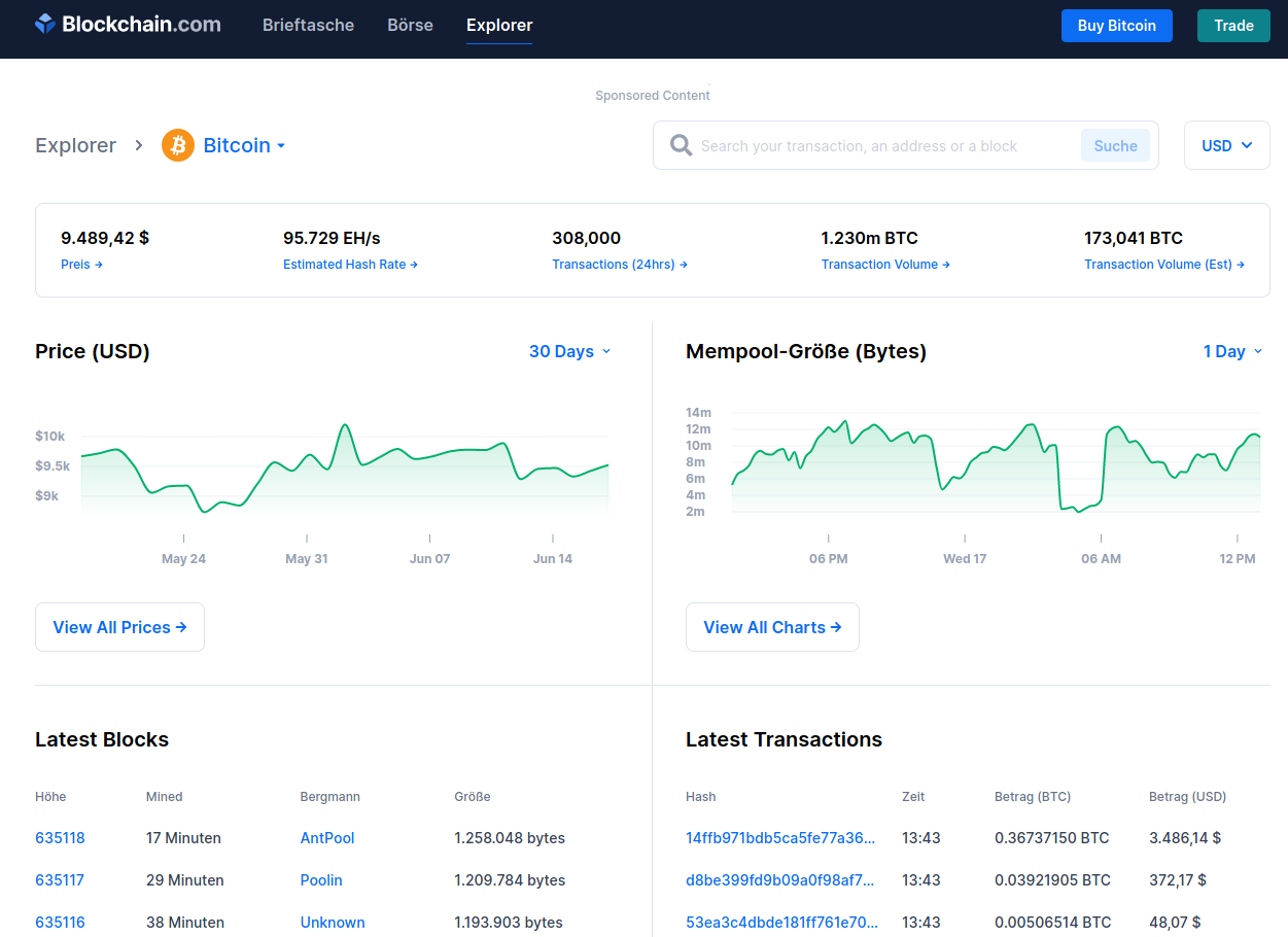 Blockchain.com bietet einen der ältesten Block-Explorer an. Dieser unterstützt nicht nur Bitcoin, sondern auch den Ethereum Kurs und Bitcoin Cash (BCH).