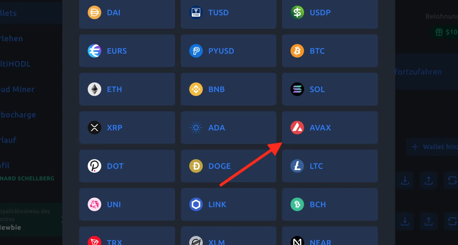 Wähle anschließend eine der gewünschten Kryptowährungen aus, wir nehmen für dieses Beispiel AVAX.