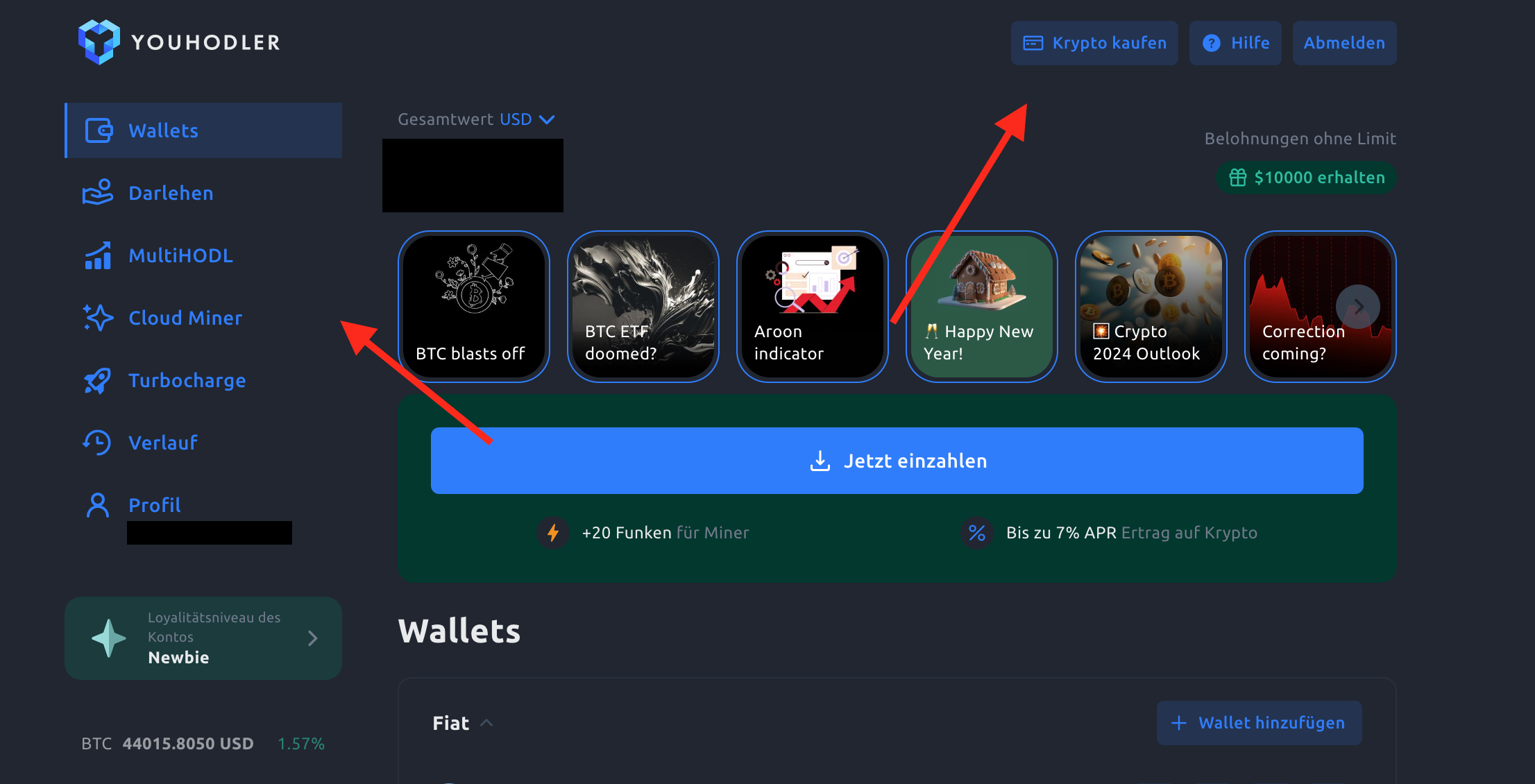 Nach Abschließen des Registrierungsprozesses, solltest du dein Dashboard einsehen können, wie im untenstehenden Bild zu sehen ist. Unter dem obersten linken Reiter “Wallets” kannst du deine Assets und die aktuellen Kurse einsehen.