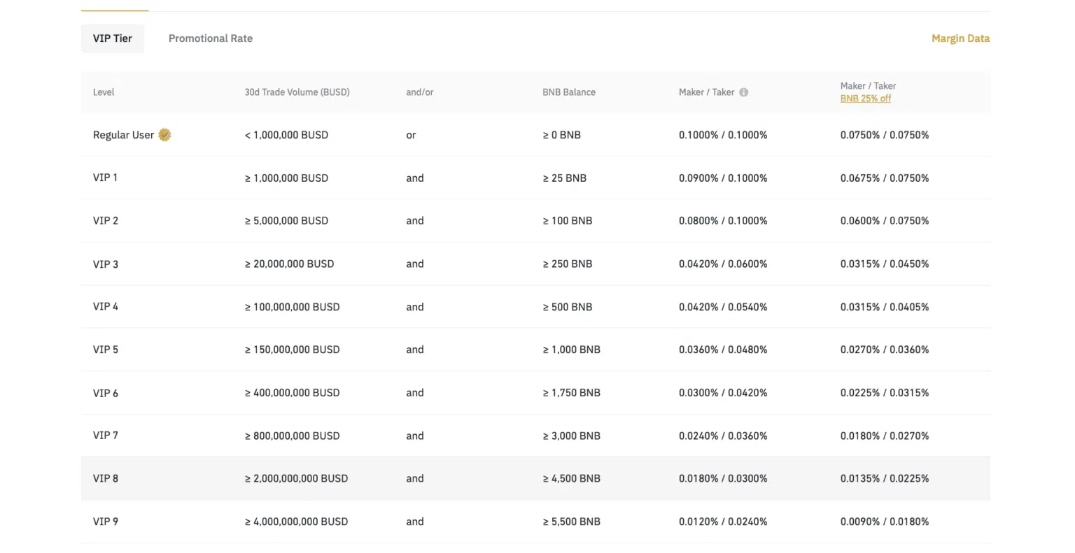 Wenn du bereit bist, deine Handelsgebühren mit dem nativen BNB-Token zu zahlen, kannst du von weiteren Discounts profitieren. Die Gebührenstruktur der Plattform ist äußerst transparent und gibt sogar die Kredit- oder Margenzinssätze im Voraus bekannt. Auch diese hängen von deinem VIP-Level und dem Vermögenswert ab, den du beleist.