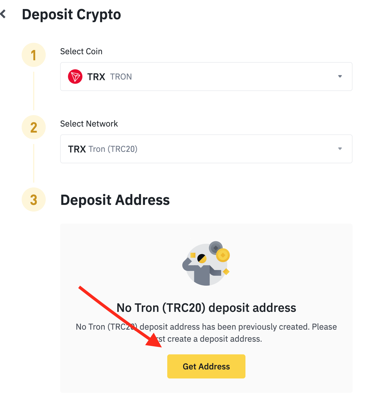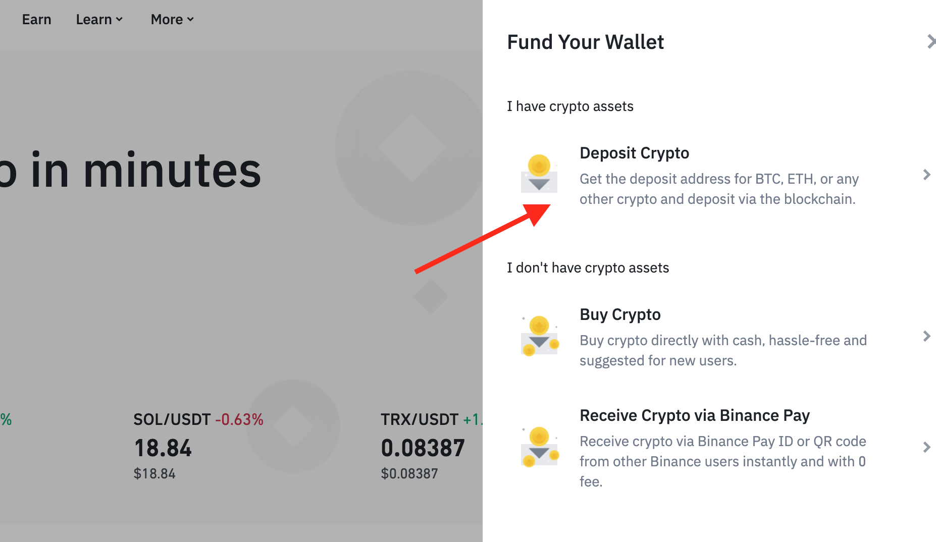 Falls du bereits digitale Vermögenswerte besitzt und diese einzahlen möchtest, kannst du anschließend “Deposit Crypto” auswählen. Binance veranschlagt keine Mindesteinzahlungen.