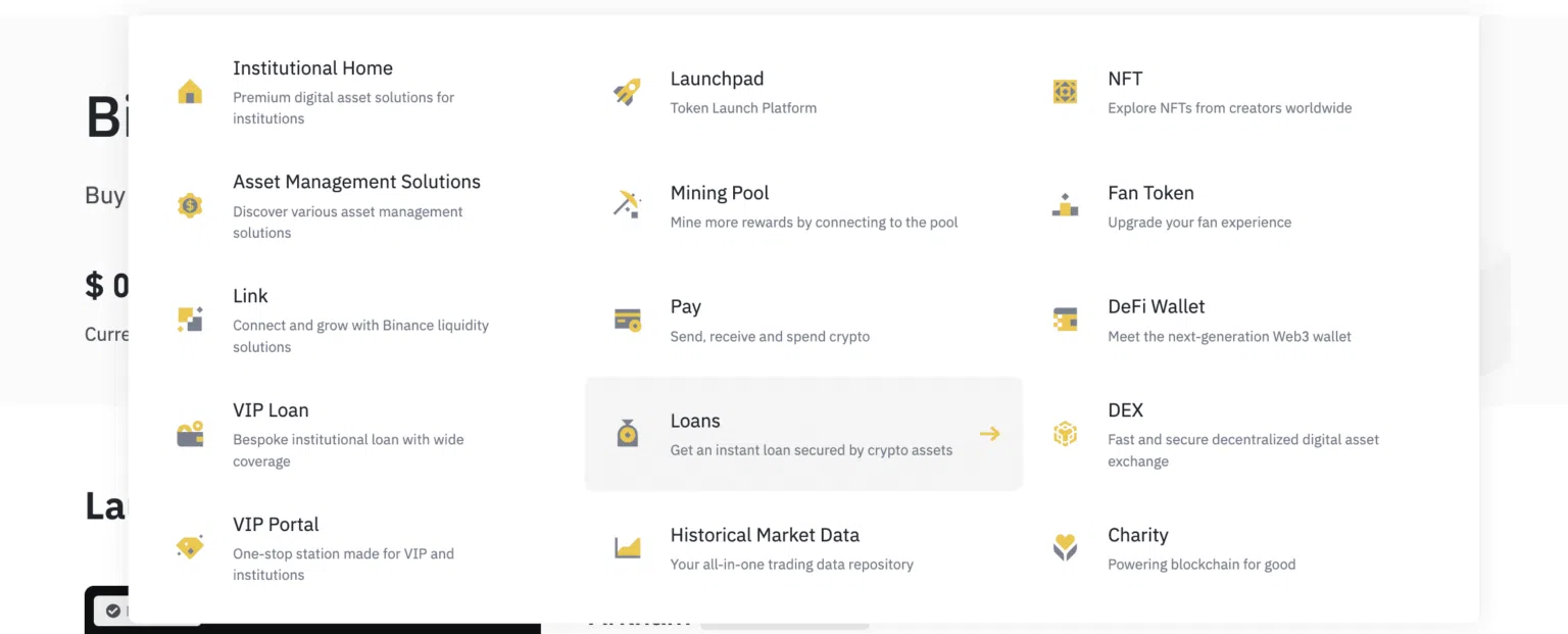 Zusätzlich zu diesen Funktionen können Privatanleger:innen auch Krypto-Kredite erhalten, einen funktionsreichen NFT-Marktplatz nutzen und je nach Bedarf sogar Markt-Daten recherchieren. Hier kannst du der gesamte Katalog abgebildet.