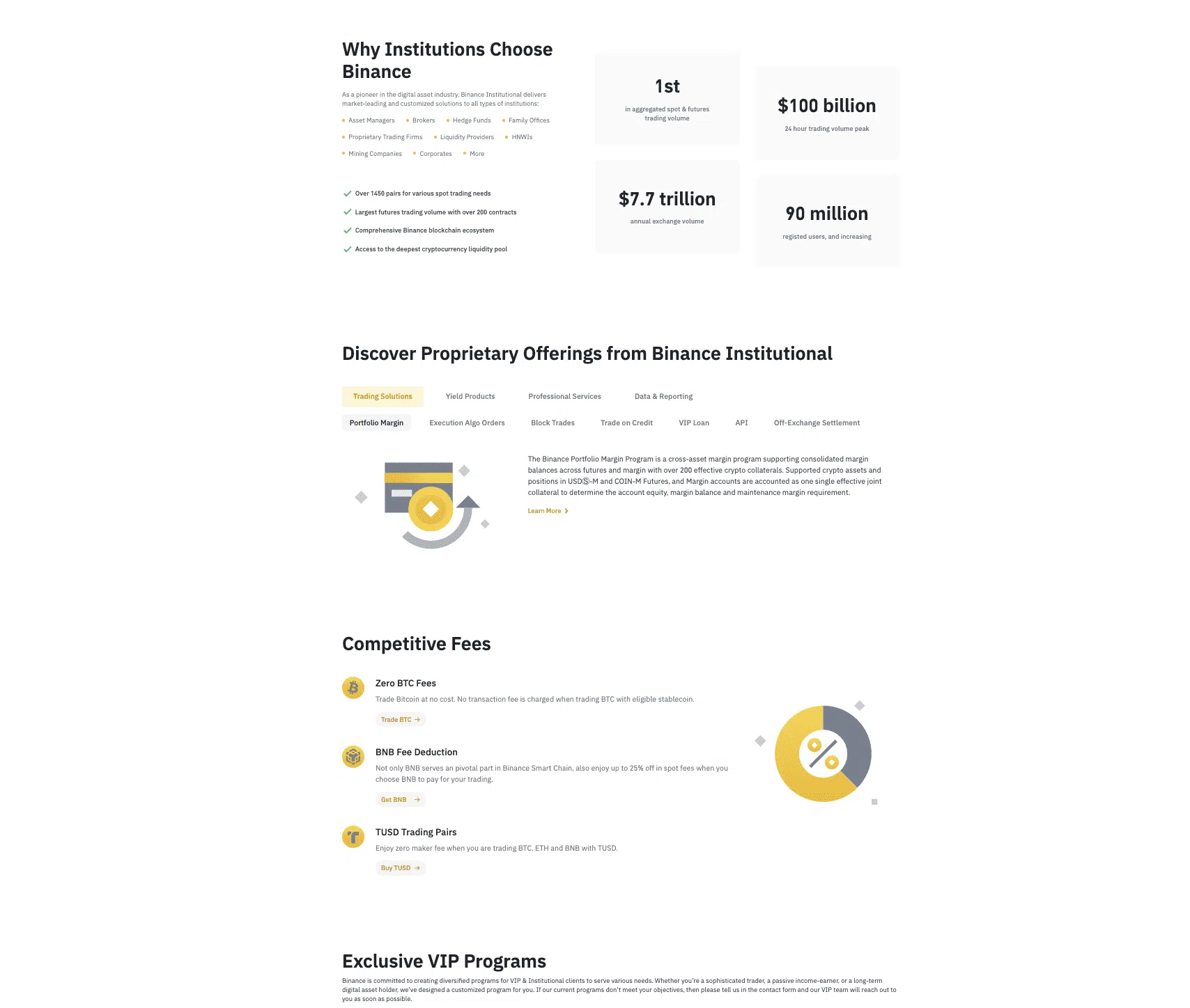 Für Institutionen und VIPs bietet Binance ein Premium– und anpassbares Portal mit einer detaillierten und aufschlussreichen Übersicht über die Branchenanalysen, exklusive Angebote wie Whitelisting Margin-Borrowing und ein dediziertes Reporting-Center.