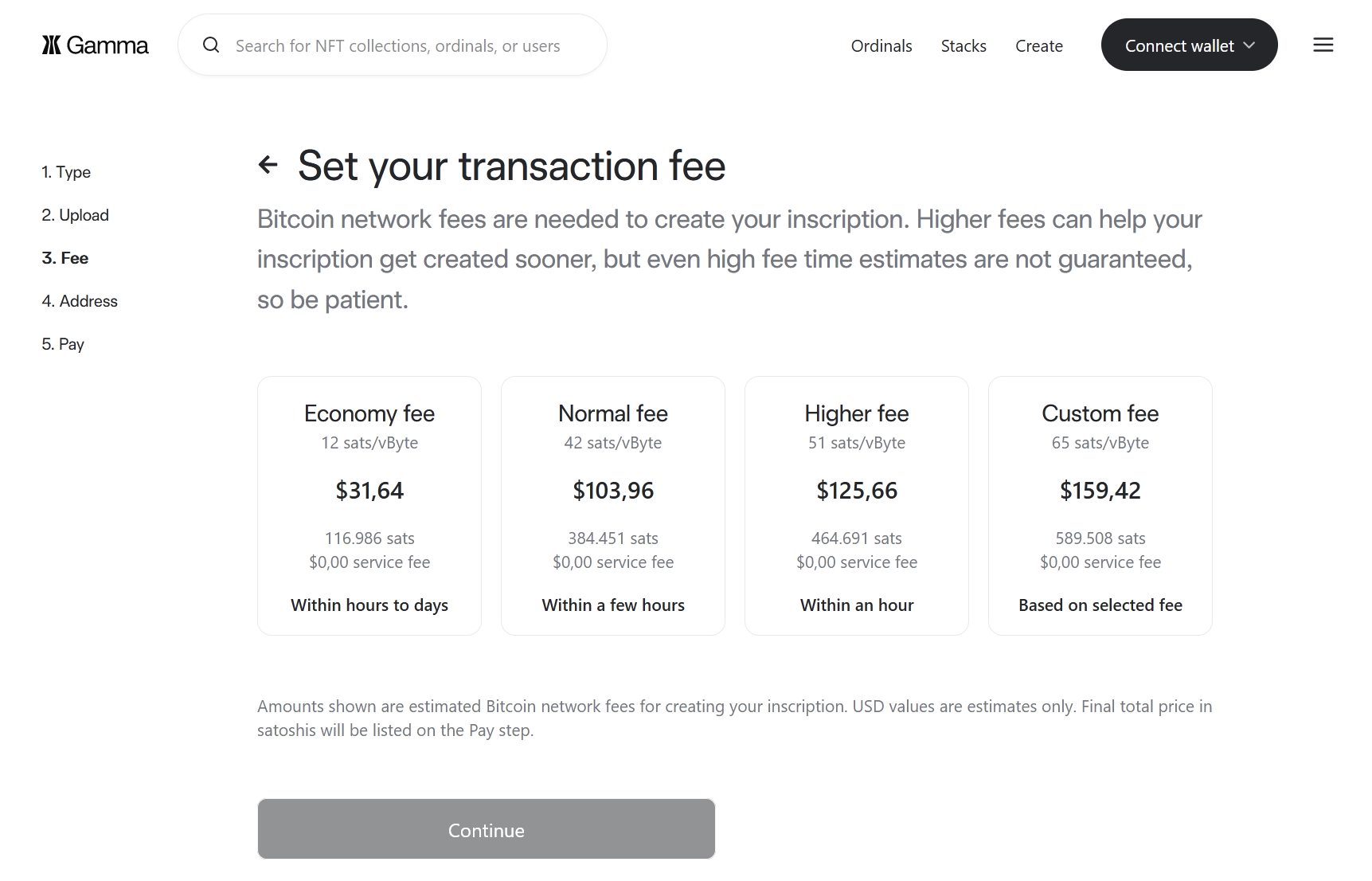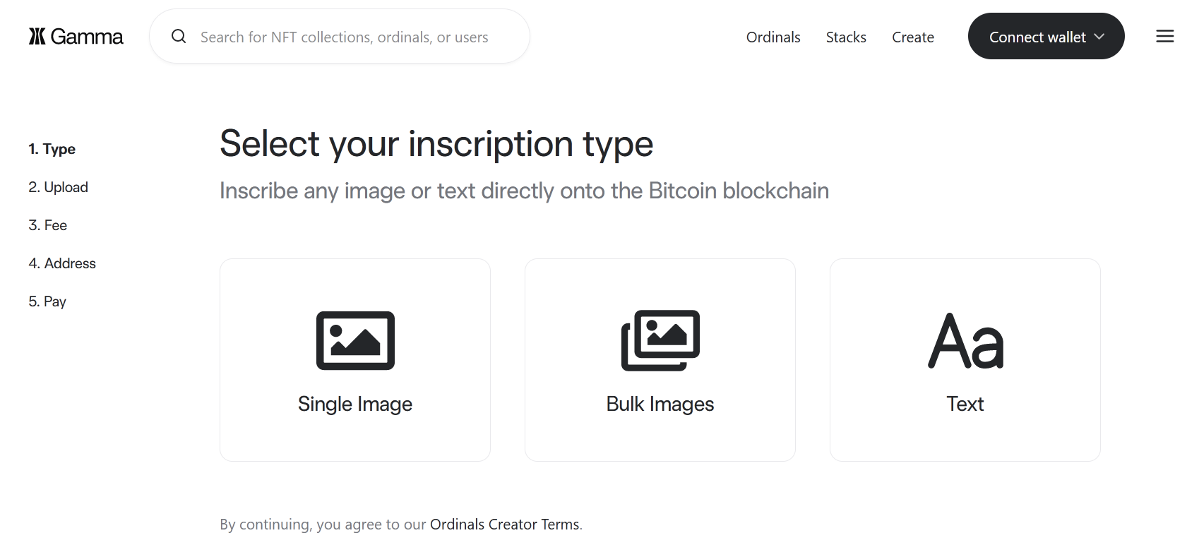 Nachdem du deine Ordinals Wallet eingerichtet hast und genügend Satoshis darauf sind, schauen wir uns im nächsten Schritt an, wie man nun genau ein Bitcoin Ordinals erstellt bzw. inscripted. Mittlerweile gibt es mehrere benutzerfreundliche “no-code” Lösungen, wie z.B. Gamma.io und Ordswap.io, die es dir ermöglichen, ein Ordinals NFT ohne eigenen Bitcoin Node zu erstellen.