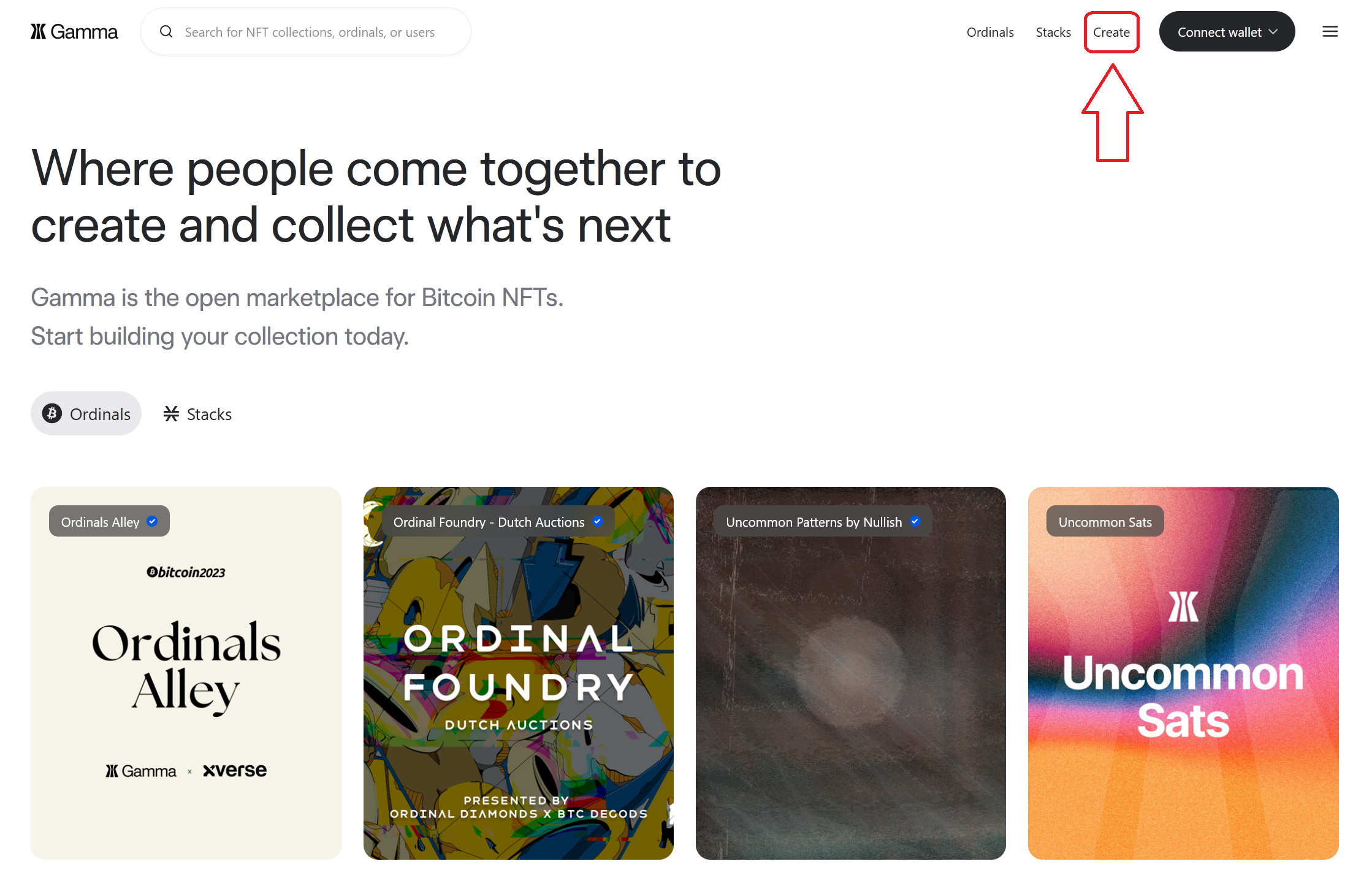 Du möchtest jetzt endlich ein Bitcoin Ordinals erstellen? Hier gehts los! Besuche zunächst die Seite gamma.io und verbinde dein Ordinals-kompatibles Wallet.