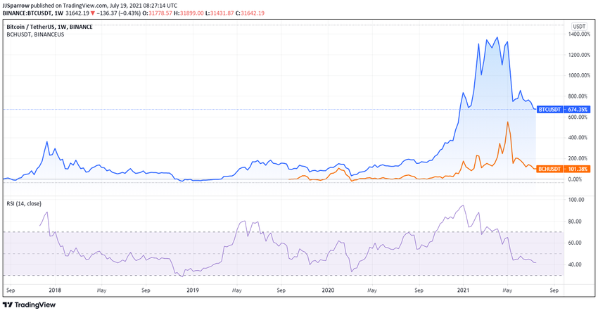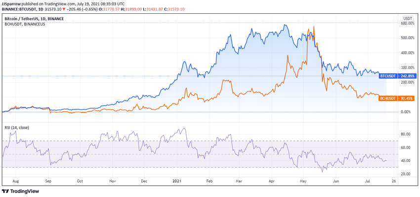 Im Jahr 2021 begrüßte Bitcoin viele neue Trader, wodurch der Wert volatil wurde, während Bitcoin Cash stabil blieb oder sogar wuchs. Bitcoin-Investoren erlebten kürzlich extreme Schwankungen auf dem Markt: Der BTC-Preis stieg Anfang dieses Jahres auf einen Höchststand von 62.000 US-Dollar, bevor der Bitcoin Preis Ende Juni auf 31.000 US-Dollar fiel. Aber trotz des Einbruchs hat Bitcoin bis Mitte des Jahres 2021 eine Rendite von 243 % für die Anleger erzielt.