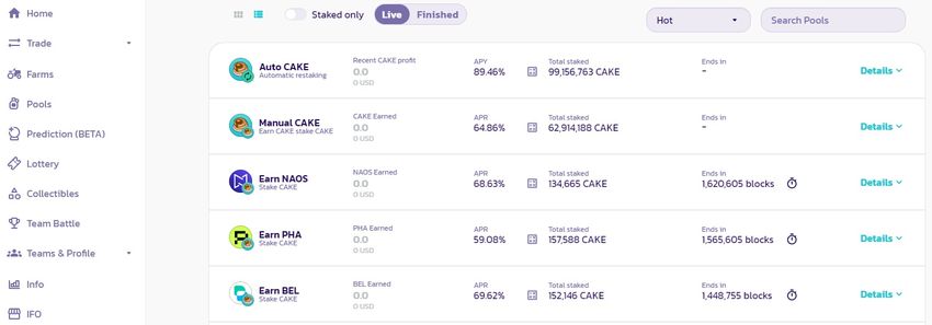 Diese Pools ändern sich ständig. Du wirst feststellen, dass die Plattform viele verschiedene Liquiditätspools hat. Normalerweise haben die neuen Token aufgrund ihrer geringen Liquidität die höchsten Belohnungen.