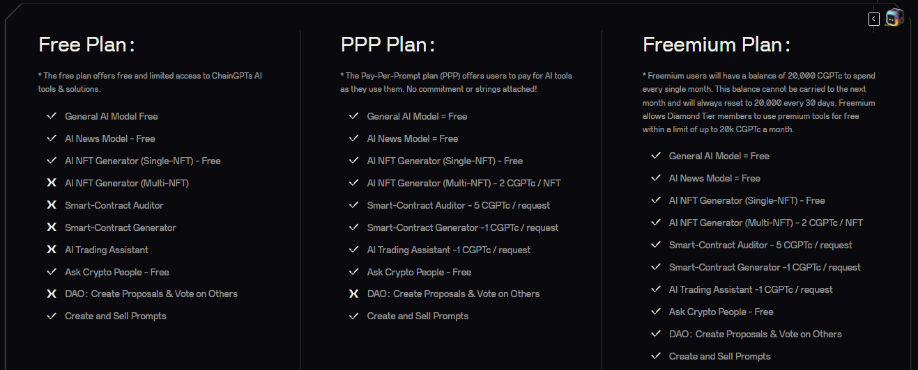 Der Multi-NFT-Generator, der Smart-Contract-Prüfer, der Smart-Contract-Generator und der AI-Handelsassistent der Plattform sind alle im PPP-Plan verfügbar. Der Freemium-Plan bietet den Nutzern ein monatliches Guthaben von 20.000 $CGPT, das alle 30 Tage zurückgesetzt wird und nicht übertragen werden kann.