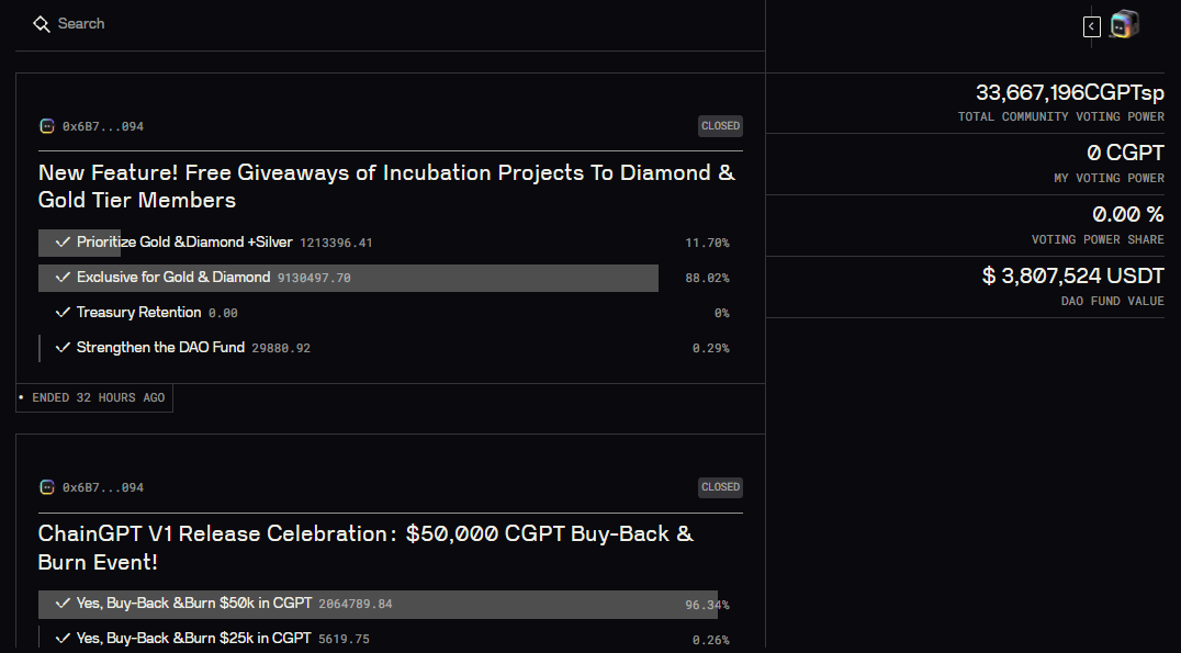 - Teilnahme an der DAO-Verwaltung: Mitglieder der Gemeinschaft und Staker von $CGPT können an der DAO teilnehmen. Sie können Ideen erstellen und darüber abstimmen, entscheiden, wie das DAO-Kapital ausgegeben wird, und über die zukünftige Entwicklung des Ökosystems entscheiden.