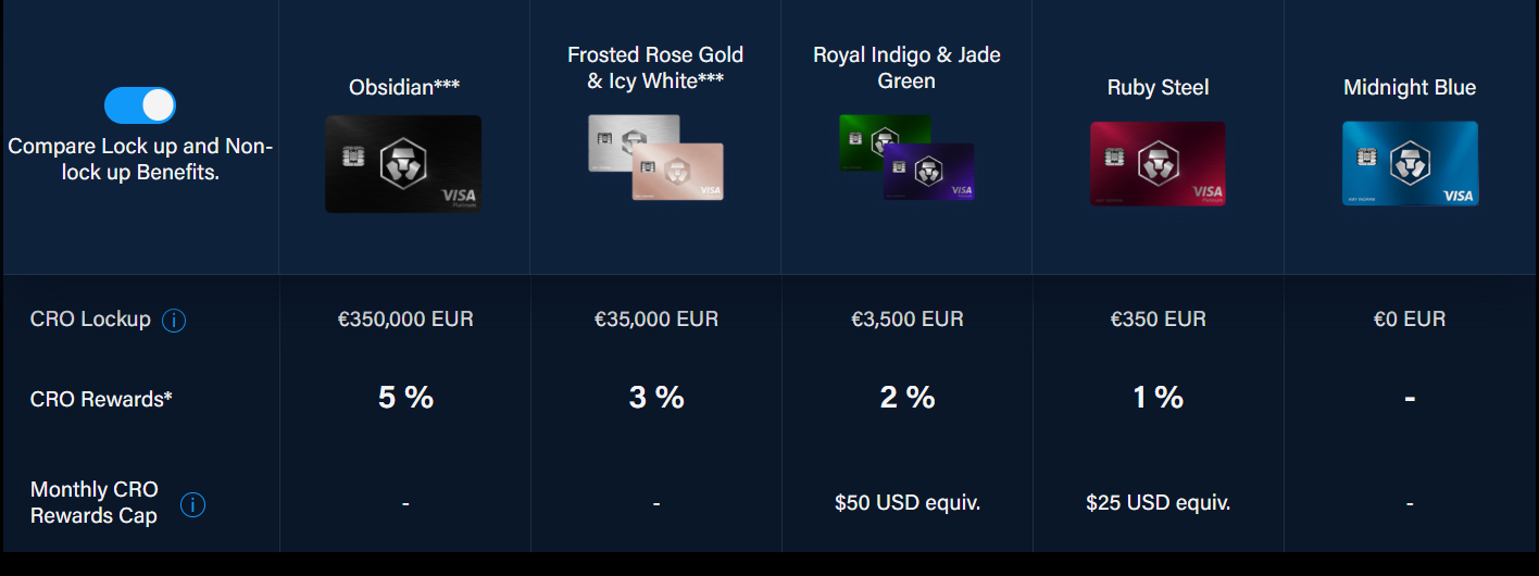 - Die Vorteile variieren je nach Kartentyp, höheres Staking von CRO-Token erforderlich, um die besten Kartenlevel zu erhalten