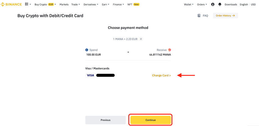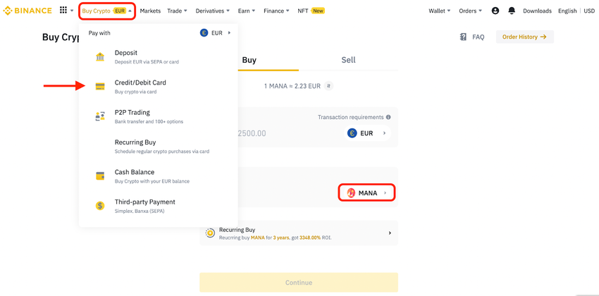 Nachdem dein Konto verifiziert wurde, gehst du zu Krypto kaufen und wählst Kredit-/Debitkarte. Du kannst deine Fiat-Währung und die gewünschte Kryptowährung auswählen. In diesem Fall werden wir uns für den direkten Kauf von MANA entscheiden.