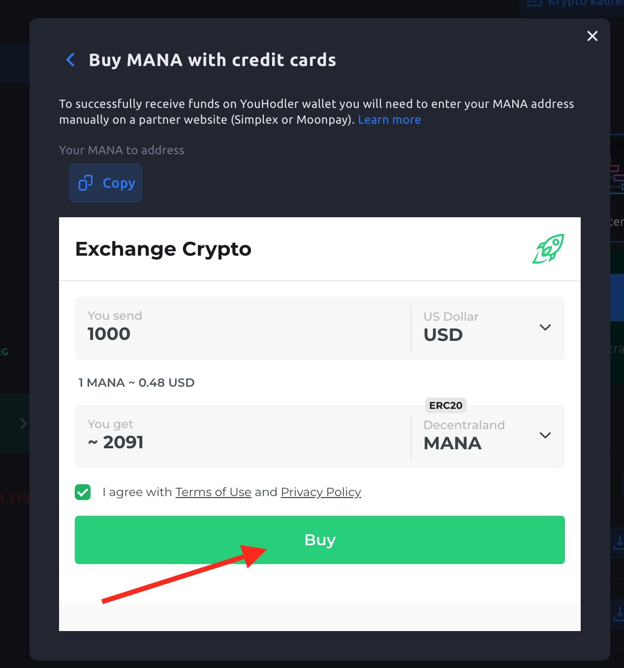 Du kannst den Token auf verschiedene Arten erwerben, z. B. durch In-Game Belohnungen, den Verkauf von Items auf dem integrierten Marktplatz oder über eine Krypto Börse. Natürtlich kannst du MANA auch einfach mit einer Kreditkarte an den verschiedensten Krypto Börsen kaufen, darunter Youhodler, OKX und Wirex.