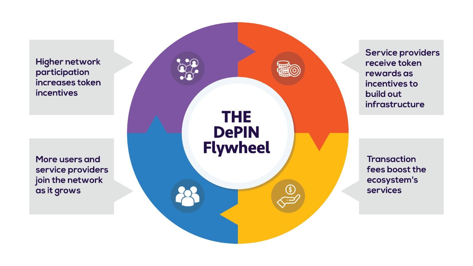 Das DePIN-Flywheel zeigt, wie DePINs funktionieren, um Anreize für Nutzer zu schaffen, physische Infrastrukturen aufzubauen, die andere benötigen, ohne die hohen Vorlaufkosten, die traditionell erforderlich wären.