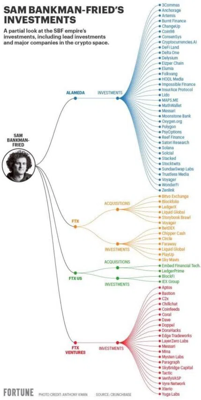 Aber das ist nicht alles. FTX hat viel Werbung für Krypto aber auch für sich selbst gemacht. Und während seines Aufstiegs investierte FTX in mehrere andere Unternehmen und übernahm sie danach.