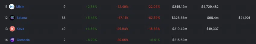 - Solana (SOL) liegt auf Platz 14 der Liste nach Marktkapitalisierung und damit jetzt einen Platz hinter Shiba Inu.