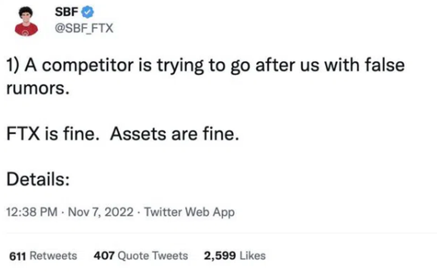 Am 7. November 2022 twitterte SBF, dass FTX-Assets in Ordnung seien. Später wurde klar, es war nur ein Versuch, Optimismus zu verbreiten. Der Tweet wurde kurze Zeit später wieder gelöscht.
