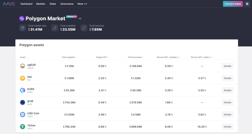 Aave ist ein DeFi-Protokoll dass es den Menschen ermöglicht Kryptowährungen von jedem zu leihen und zu verleihen, ohne dass ein zentraler Vermittler erforderlich ist. Wenn Nutzer ihre Kryptowährungen verleihen, erhalten sie die Zinsen die der Kreditnehmer dafür zahlt.