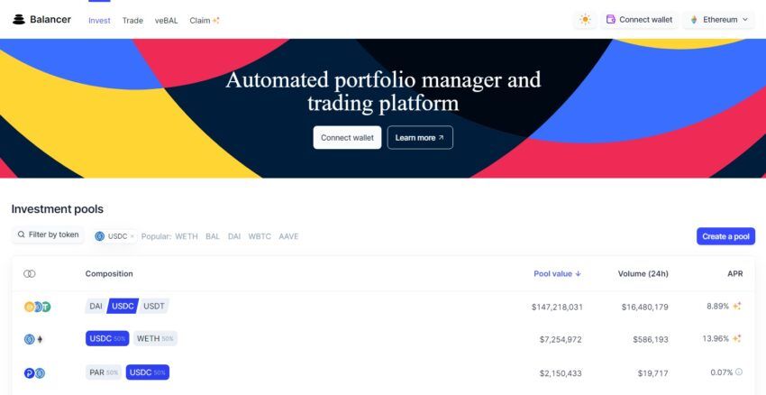 Balancer ist eine AMM DEX und gehört zu den besten DeFi-Anwendungen auf der Ethereum Blockchain. Die Plattform ermöglicht es Nutzern Token in einen der verfügbaren Pools einzuzahlen.