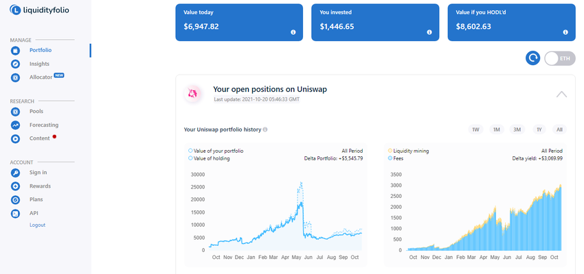 - Metriken für ihre Investitionen überwachen (Gewinn, Verlust, Impermanent Loss und Farming-Belohnungen)
