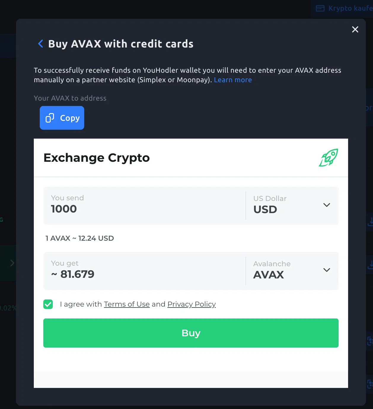 Über Youhodler kannst du Kryptowährungen sofort und unkompliziert kaufen – selbst mit Fiatgeld. Klicke dafür einfach auf den Button “Krypto kaufen” (siehe oberes Bild) und wähle ob du mit Fiat oder Krypto zahlen möchtest.
