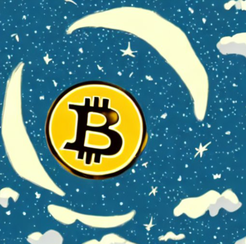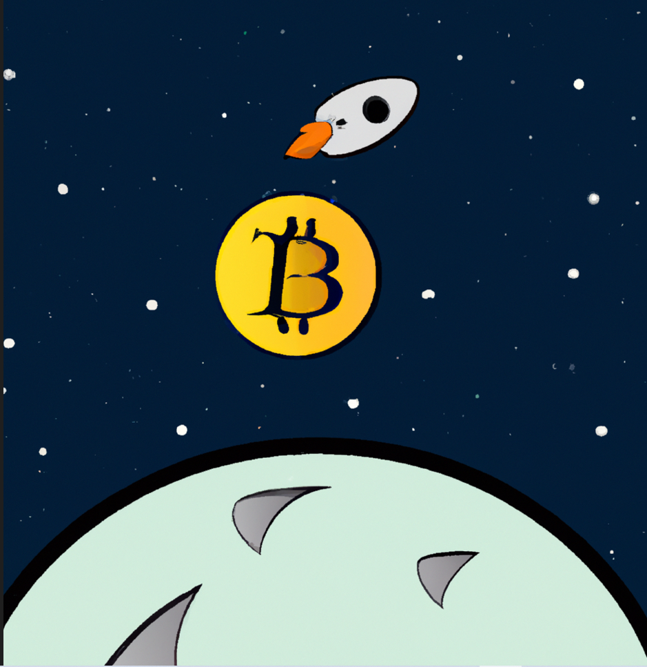 “A cartoon style image of a bitcoin coin flying towards the moon in space”