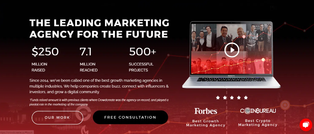 Crowdcreate ist eine Agency für Wachstumsmarketing, die dafür bekannt ist, Projekte mit Top-Influencern und Investoren zu verbinden. Sie bietet NFT-Marketing- und Entwicklungslösungen, VIP-Networking-Möglichkeiten und Community-Management für Blockchain-Marken.