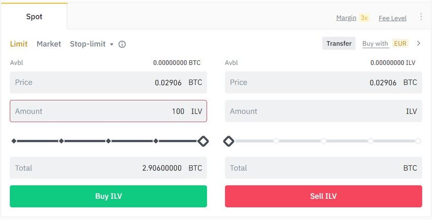 Scrolle nach unten, um einen Kauf-Auftrag für ILV/BTC zu erteilen. Das sollte so aussehen: