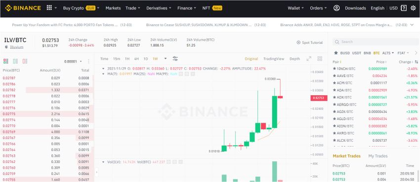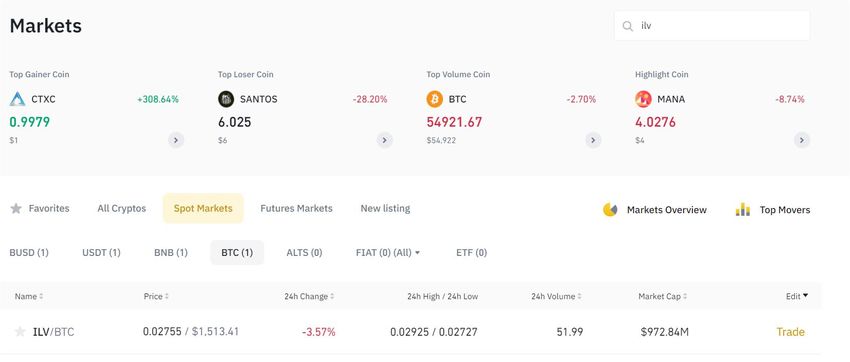 Wir werden in dieser Anleitung Bitcoin (BTC) kaufen und dann gegen ILV tauschen, aber du kannst jede der mit ILV gepaarten Coins kaufen.