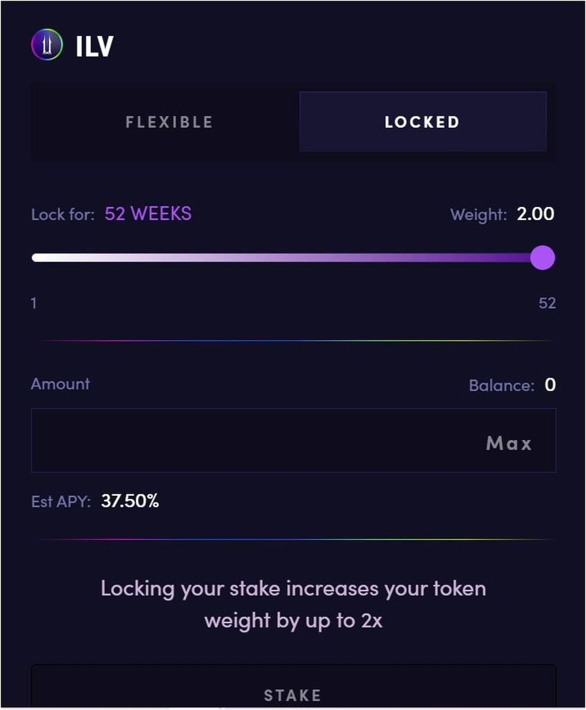 Wenn du dich für den flexiblen Modus entscheidest, ist der jährliche prozentuale Ertrag (Annual Percentage Yield, APY) zwar geringer, aber du kannst das Staking der ILV-Token jederzeit beenden. Wenn du jedoch eine höhere Rendite mit dem Staking erzielen willst, kannst du ‘Locked‘ auswählen. Dadurch werden deine Token für einen Zeitraum zwischen einer Woche und einem Jahr gesperrt, und der Ertrag ist entsprechend größer.