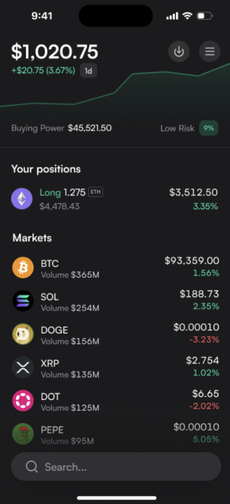- Marktzugang und Handelsflexibilität: Die App unterstützt Long- und Short-Positionen, um sowohl in steigenden als auch in fallenden Märkten zu handeln. Sie ermöglicht den Handel mit mehreren Krypto-Vermögenswerten auf einer Plattform, im Gegensatz zu den auf eine Chain beschränkten Börsen.