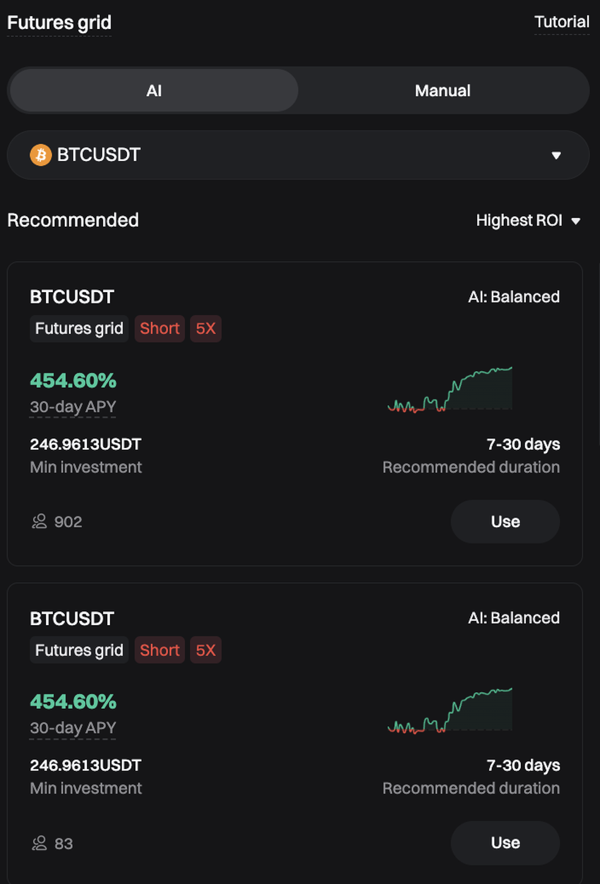 - Futures Grid Bots – Funktioniert wie der Spot Grid Bot, aber für Futures-Trading mit Hebelwirkung. Höheres Risiko, höhere Belohnung.