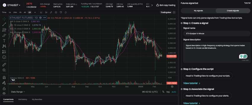 Was er tut: Führt Trades basierend auf externen Trading-Signalen von professionellen Tradern, Algorithmen oder Analysetools aus. Derzeit ist der Futures Signal Bot der einzige, der Trades auf dem Futures-Markt automatisiert, indem er Aufträge basierend auf benutzerdefinierten Trading-Signalen aus TradingView-Skripten, professionellen Tradern oder algorithmischen Strategien ausführt.